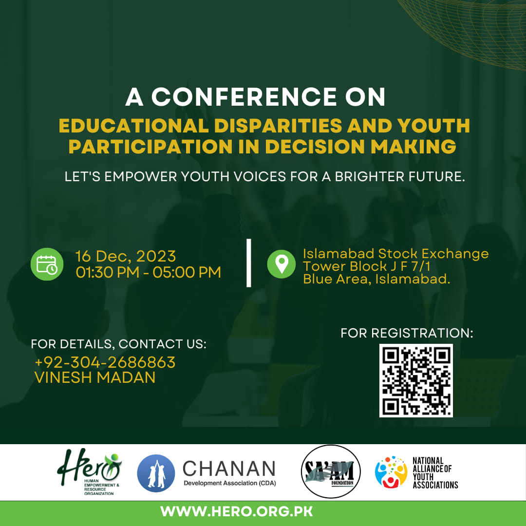 HERO, in collaboration with the SAAM Foundation, is thrilled to announce a groundbreaking conference focused on “Educational Disparities & Youth Participation in Decision Making” scheduled for December 2023 in Islamabad.